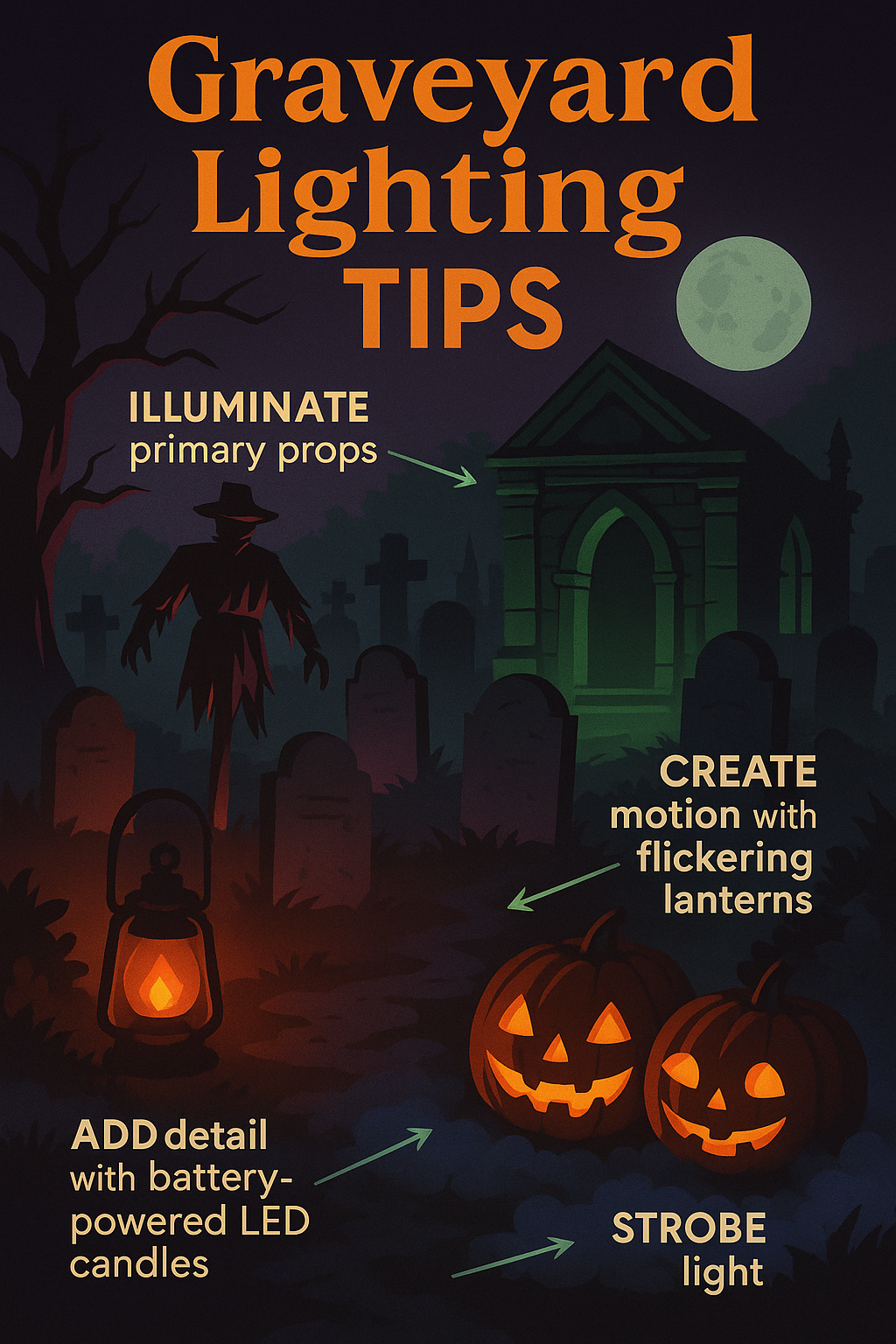 Lighting can make or break the atmosphere of your graveyard scene. Whether you’re using traditional spotlights, RGB floods, or flickering LED candles, your goal should be to highlight focal points, build depth, and add a sense of mystery. Start by identifying your primary props: tombstones, a mausoleum, a scarecrow sentinel. Illuminate them with a slight side-angle to create dramatic shadows. Use red or green backlights for contrast and silhouette. Add flickering lanterns to create motion and add realism. Battery-powered LED candles inside jack-o'-lanterns or skulls are great for adding detail. Try hiding a strobe behind fake shrubbery or low walls for lightning effects. Avoid lighting everything too brightly. Keep some elements in shadow. Use fog to catch light beams and add volume to the scene. Low-placed lights that shine upward can make statues or ghosts appear more menacing. Link your lighting to the Portal’s control system. With scripts, you can create light shows, timed pulses, or reactive flashes triggered by sound or motion. Ultimately, your lighting should guide the eye, enhance the spookiness, and support the narrative of your haunt. Experiment, take pictures, and adjust until it looks great both in person and on camera.
