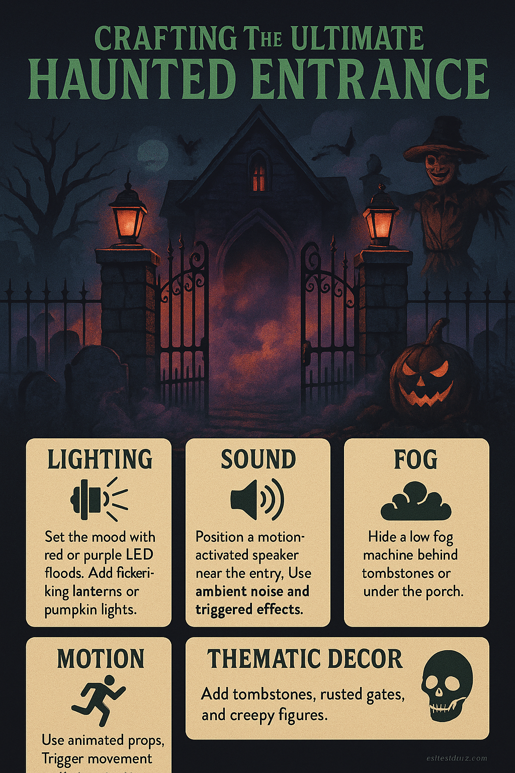 Creating an unforgettable first impression begins with your haunted entrance. This is the first and last thing guests will experience, so make it count. To build an ultimate entrance, consider layering elements: sound, lighting, fog, motion, and thematic decor. Start by setting the mood with ambient lighting. Use red or purple LED floods to cast eerie shadows across tombstones or a rusted gate. Add flickering lanterns or pumpkin lights to guide your visitors' eyes through the space. Next, use sound. A motion-activated speaker near the entry can trigger howls, whispers, or distant screams as guests approach. Layer your audio to avoid repetition—use ambient background noise on a loop and key effects on triggers. Fog adds atmosphere and helps conceal mechanics. A low fog machine with ground chillers creates a rolling mist that hugs the ground. Position it behind tombstones or under the porch for maximum diffusion. Add motion elements to surprise and delight. Servo-driven heads or arms, animated scarecrows, or jumping spiders are excellent choices. Trigger them via motion sensors or custom scripts on your Halloween Portal. Your entrance sets the tone. Use your device scripts and control system to time the scares, build suspense, and create a truly immersive experience.